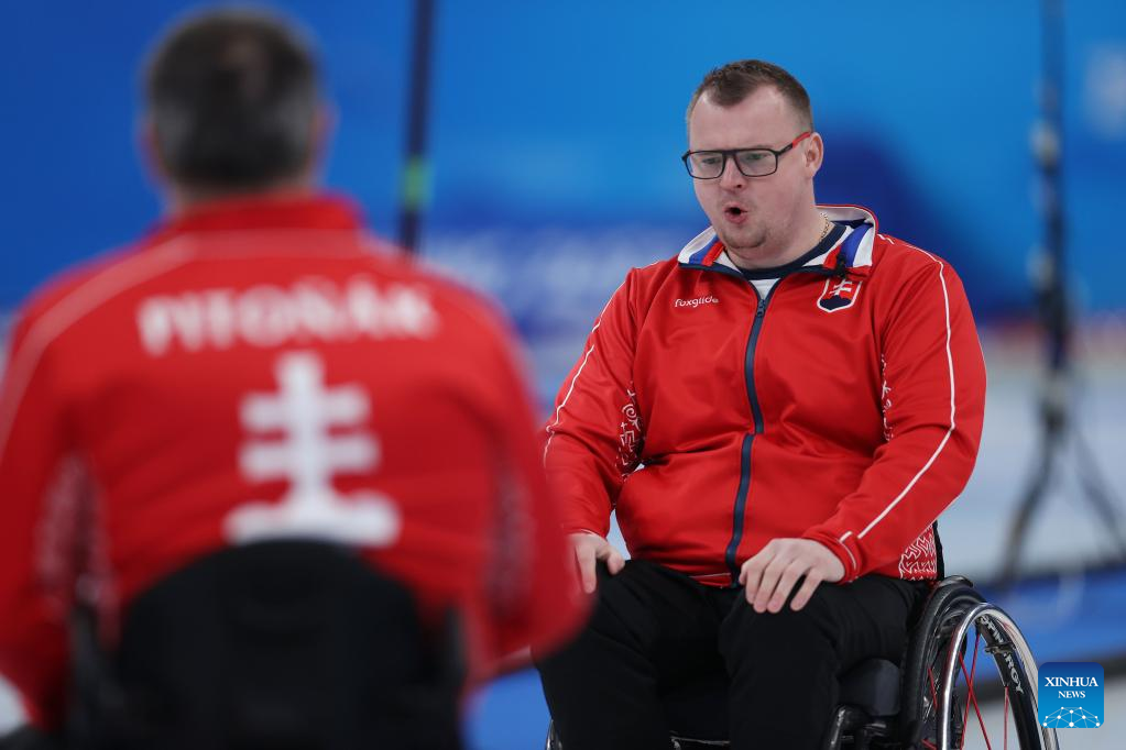 Peter Zatko (R) of Slovakia takes a breath during the Wheelchair Curling Bronze Medal Match between Slovakia and Canada of Beijing 2022 Winter Paralympics at National Aquatics Centre in Beijing, capital of China, on March 11, 2022. (Xinhua/Xu Yanan)