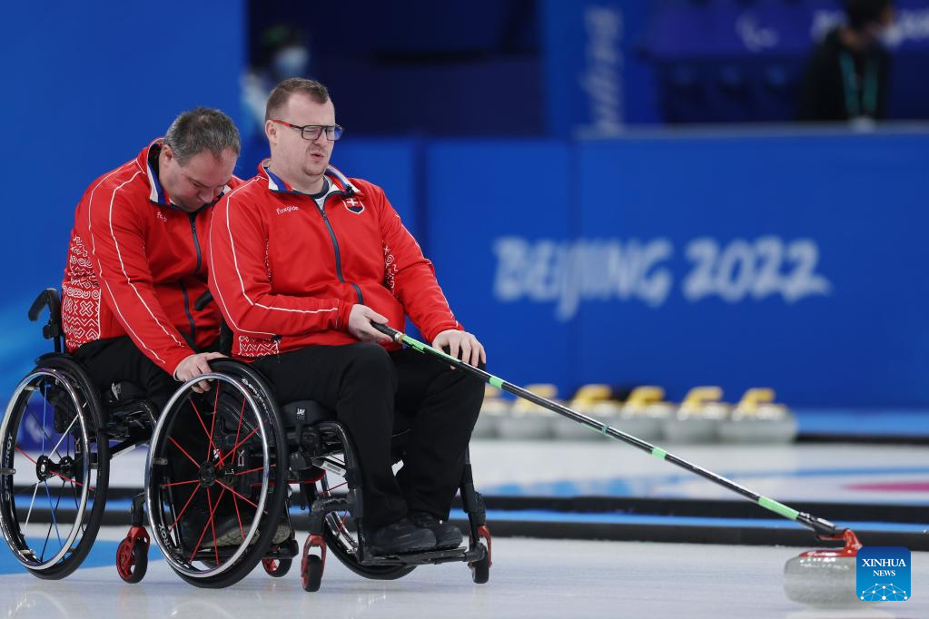 Peter Zatko (R) of Slovakia competes during the Wheelchair Curling Bronze Medal Match between Slovakia and Canada of Beijing 2022 Winter Paralympics at National Aquatics Centre in Beijing, capital of China, on March 11, 2022. (Xinhua/Xu Yanan)