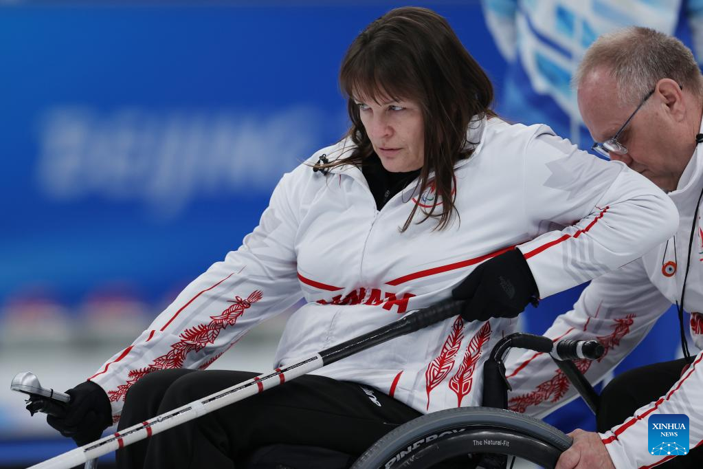 Ina Forrest (L) of Canada competes during the Wheelchair Curling Bronze Medal Match between Slovakia and Canada of Beijing 2022 Winter Paralympics at National Aquatics Centre in Beijing, capital of China, on March 11, 2022. (Xinhua/Xu Yanan)