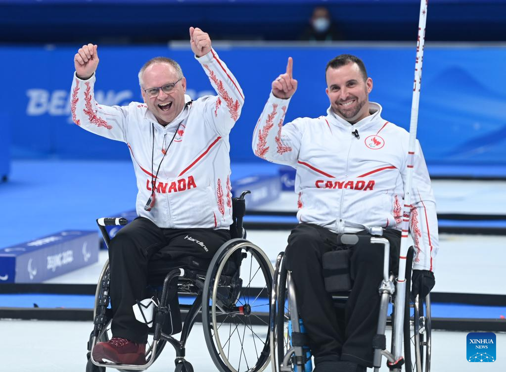Jon Thurston (R) and Dennis Thiessen of Canada celebrate after the wheelchair curling Bronze Medal Match between Slovakia and Canada of Beijing 2022 Winter Paralympic Games at National Aquatics Centre in Beijing, capital of China, on March 11, 2022. (Xinhua/Ren Chao)