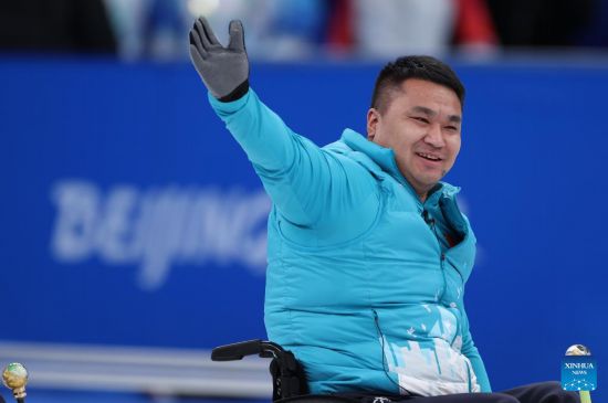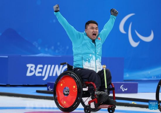 Wang Haitao of China celebrates victory after the Wheelchair Curling Gold Medal Match between China and Sweden of Beijing 2022 Paralympic Winter Games at National Aquatics Centre in Beijing, capital of China, on March 12, 2022. (Xinhua/Du Xiaoyi)