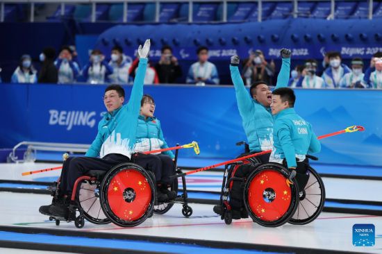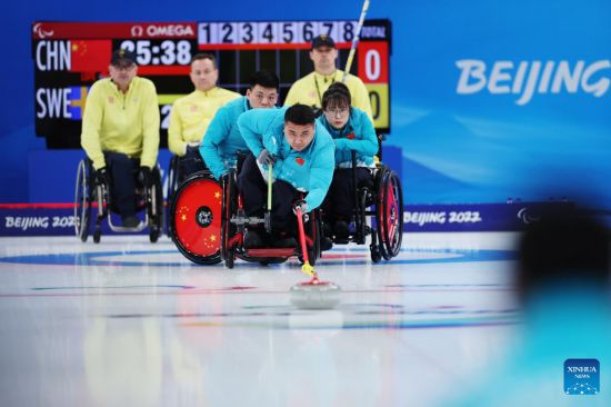 BEIJING, March 12 (Xinhua) -- Defending champion China bagged the wheelchair curling gold at the Beijing 2022 Paralympics Winter Games on Saturday after defeating Sweden 8-3 at the National Aquatics Centre.