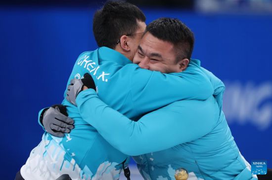 Wang Haitao (R) of China celebrates with teammate Chen Jianxin after the Wheelchair Curling Gold Medal Match between China and Sweden of Beijing 2022 Paralympic Winter Games at National Aquatics Centre in Beijing, capital of China, on March 12, 2022. (Xinhua/Du Xiaoyi)