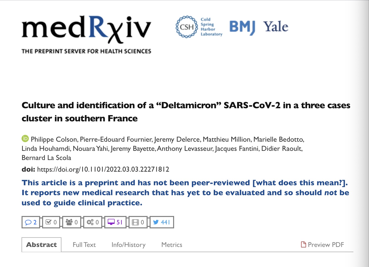 Screenshot of report named "Culture and identification of a 'Deltamicron' SARS-CoV-2 in a three cases cluster in southern France" posted on medRxiv, March 3, 2022.