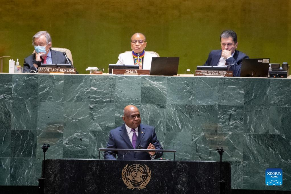 UN General Assembly President Abdulla Shahid (bottom) addresses the opening of the 66th session of the Commission on the Status of Women at the UN Headquarters in New York on March 14, 2022. Shahid said Monday that the next UN secretary-general should be female. (Eskinder Debebe/UN Photo/Handout via Xinhua)