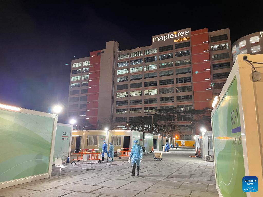 Photo taken with a mobile phone shows medical staff members working at a community isolation facility in south China's Hong Kong, March 12, 2022. (Xinhua)