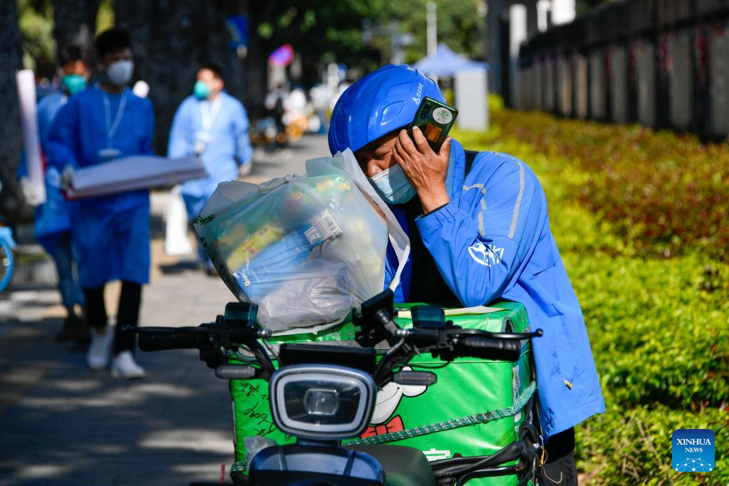 A deliveryman works in Futian District of Shenzhen, south China's Guangdong Province, March 10, 2022.