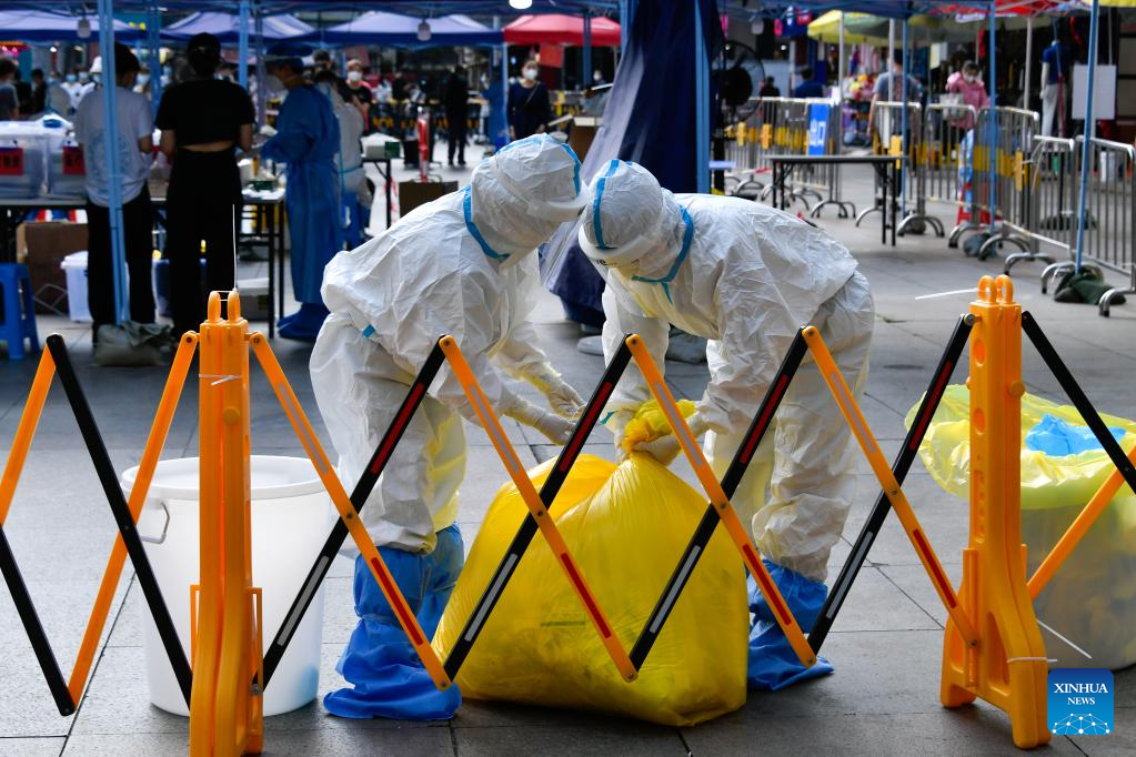 Medical workers clean up medical waste at a nucleic acid testing site in Luohu District of Shenzhen, south China's Guangdong Province, March 13, 2022. In southern China's metropolis Shenzhen, which reported 75 confirmed locally transmitted cases on Sunday, the bus and subway systems were suspended, and businesses, except those providing essential services, have been closed from Monday to March 20.
