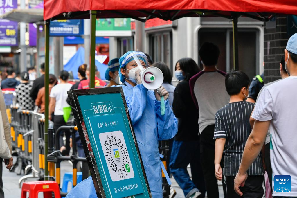 A volunteer in protective gear guides citizens at a nucleic acid testing site in Luohu District of Shenzhen, south China's Guangdong Province, March 13, 2022. In southern China's metropolis Shenzhen, which reported 75 confirmed locally transmitted cases on Sunday, the bus and subway systems were suspended, and businesses, except those providing essential services, have been closed from Monday to March 20.