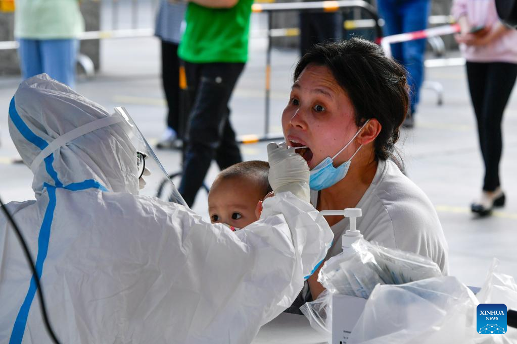 A medical worker takes a swab sample from a citizen for nucleic acid test at a testing site in Luohu District of Shenzhen, south China's Guangdong Province, March 13, 2022. In southern China's metropolis Shenzhen, which reported 75 confirmed locally transmitted cases on Sunday, the bus and subway systems were suspended, and businesses, except those providing essential services, have been closed from Monday to March 20.