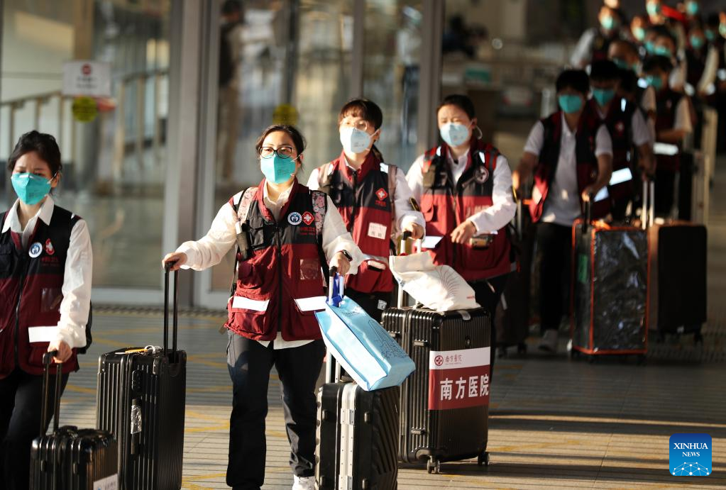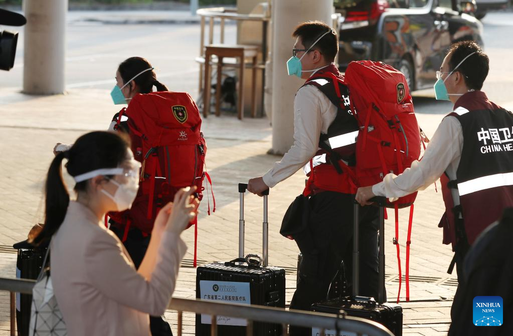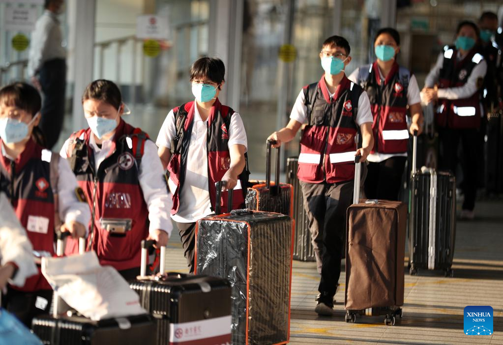 The latest batch of the Chinese mainland medical staff arrive in Hong Kong, south China, March 14, 2022, to support the local fight against the COVID-19 epidemic. The team includes 36 doctors and 39 nurses from 14 public hospitals in the neighboring Guangdong Province. (Xinhua/Li Gang)