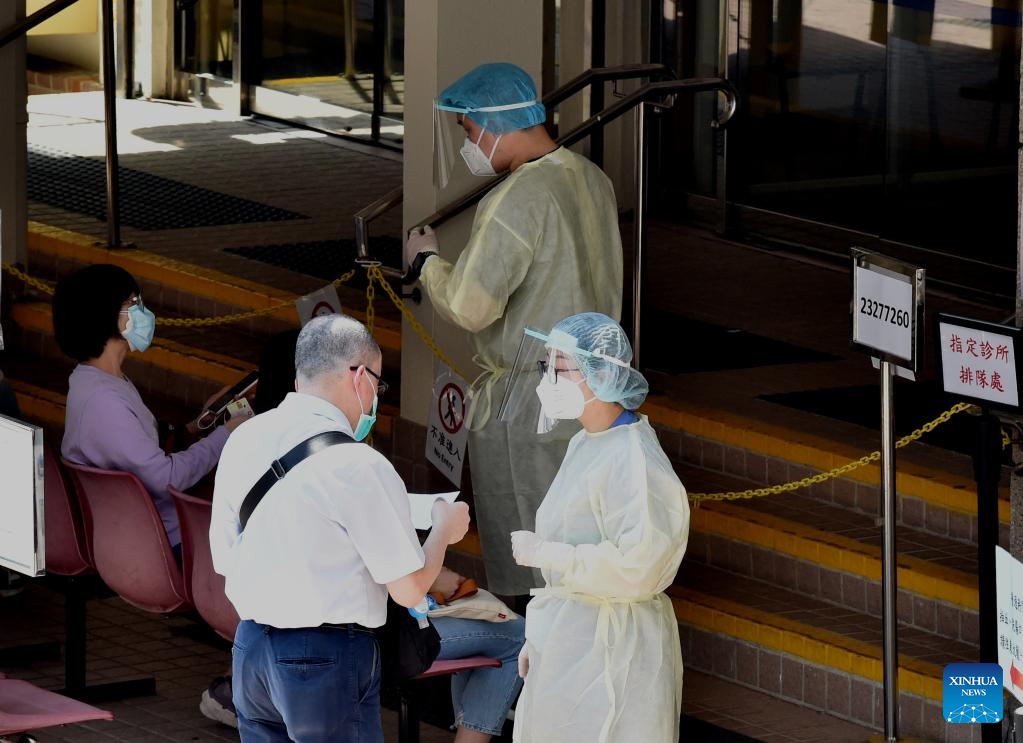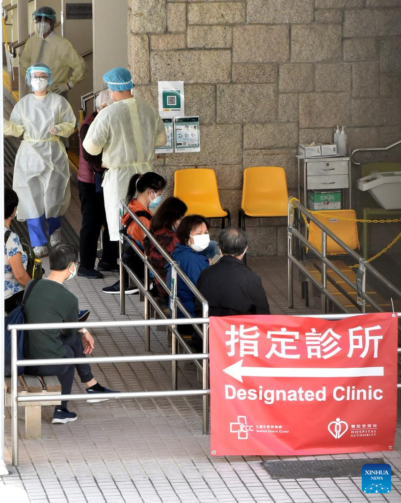 Citizens wearing face masks wait at a designated clinic in Hong Kong, south China, March 14, 2022. On Monday, Hong Kong registered 12,040 new COVID-19 cases by nucleic acid tests, and 14,868 additional positive cases through self-reported rapid antigen tests, official data showed. (Xinhua/Lo Ping Fai)