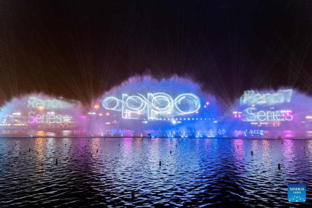 Photo taken on March 13, 2022 shows the fountain show at the launching event of the OPPO Reno7 series held in the Boulevard City of Riyadh Season, in Riyadh, Saudi Arabia. Chinese smartphone manufacturer OPPO has introduced its Reno7 series 5G phones in Saudi Arabia, marking the first launch of the brand's series in the Middle East market. (OPPO/Handout via Xinhua)