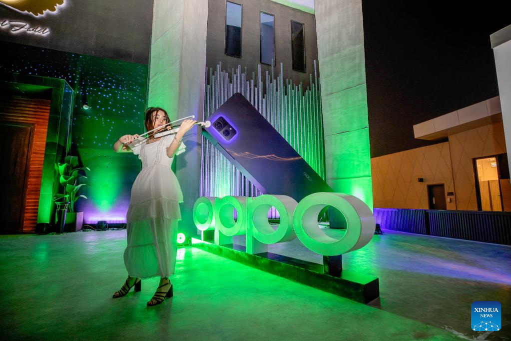 A woman performs at the launching event of the OPPO Reno7 series held in the Boulevard City of Riyadh Season, in Riyadh, Saudi Arabia, March 13, 2022. Chinese smartphone manufacturer OPPO has introduced its Reno7 series 5G phones in Saudi Arabia, marking the first launch of the brand's series in the Middle East market. (OPPO/Handout via Xinhua)