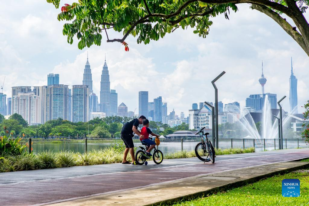People ride a bicycle at a park in Kuala Lumpur, Malaysia, March 11, 2022. (Xinhua/Zhu Wei)