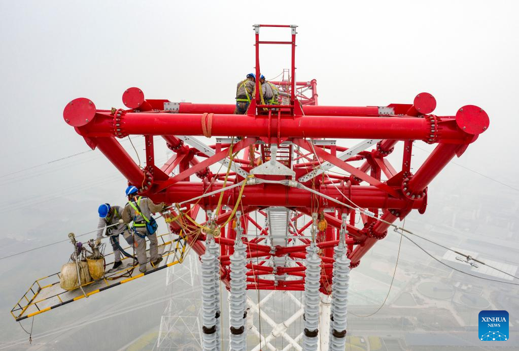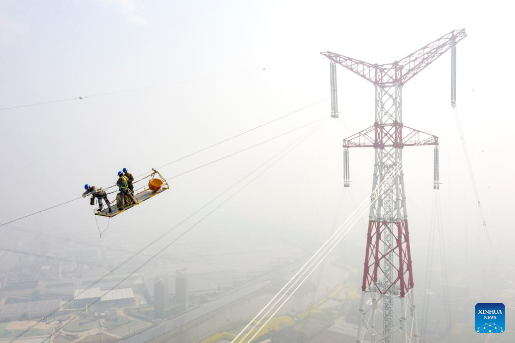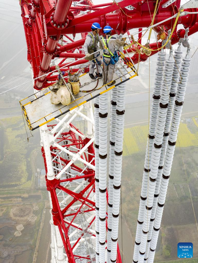 Aerial photo taken on March 14, 2022 shows staff members working on the ultra-high-voltage (UHV) direct current transmission line in Wuhu, east China's Anhui Province. The last six conductors were laid out in Anhui section of Baihetan-Jiangsu ±800-kilovolt UHV direct current power transmission project on March 14, marking the completion of the Anhui section of the power transmission line across the Yangtze River. The project stretching from Baihetan in southwest China's Sichuan Province to east China's Jiangsu Province is an important part of the country's west-to-east power transmission program. Once operational, the project will deliver more than 31.2 billion kWh of electricity annually. (Xinhua/Zhou Mu)
