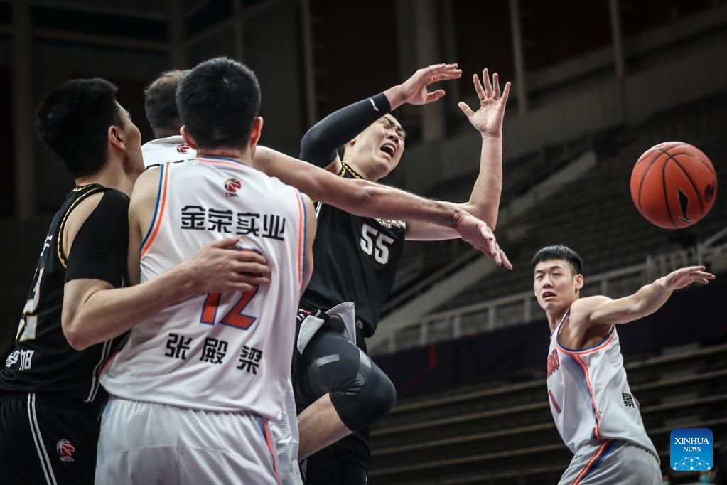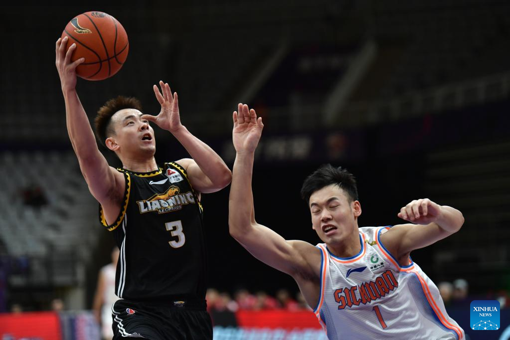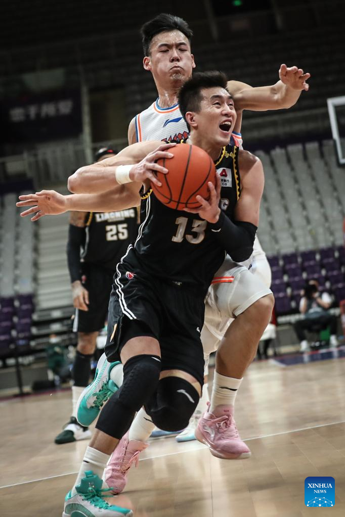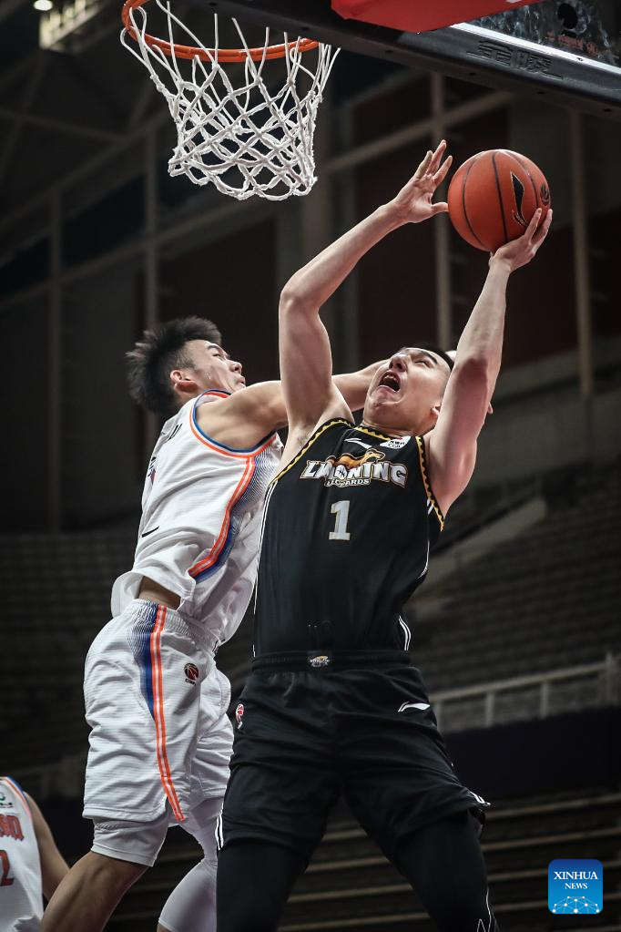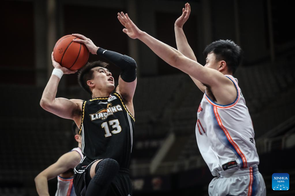 Fu Hao (R) of Liaoning Flying Leopards competes during the 35th round match between Liaoning Flying Leopards and Sichuan Blue Whales at the 2021-2022 season of the Chinese Basketball Association (CBA) league in Shenyang of northeast China's Liaoning Province, March 15, 2022. (Xinhua/Wang Yijie)