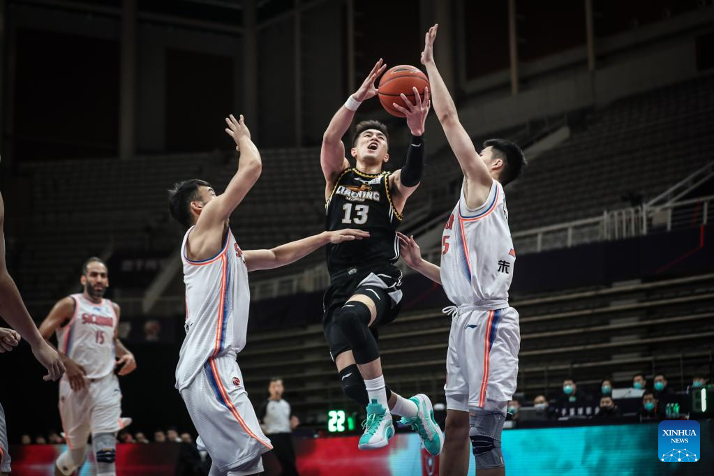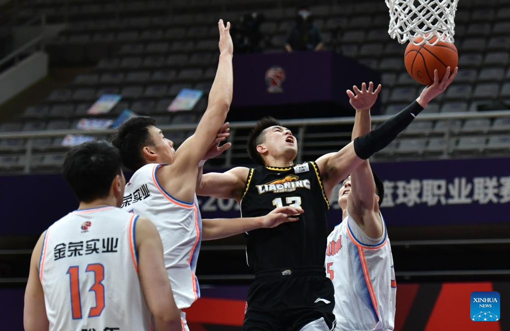 Han Dejun (2nd R) of Liaoning Flying Leopards competes during the 35th round match between Liaoning Flying Leopards and Sichuan Blue Whales at the 2021-2022 season of the Chinese Basketball Association (CBA) league in Shenyang of northeast China's Liaoning Province, March 15, 2022. (Xinhua/Pan Yulong)
