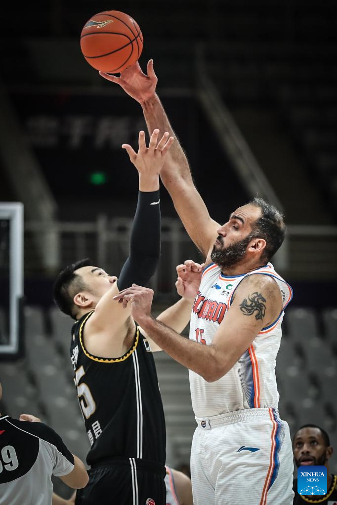 Hamed Haddadi (R) of Sichuan Blue Whales jumps the ball during the 35th round match between Liaoning Flying Leopards and Sichuan Blue Whales at the 2021-2022 season of the Chinese Basketball Association (CBA) league in Shenyang of northeast China's Liaoning Province, March 15, 2022. (Xinhua/Pan Yulong)