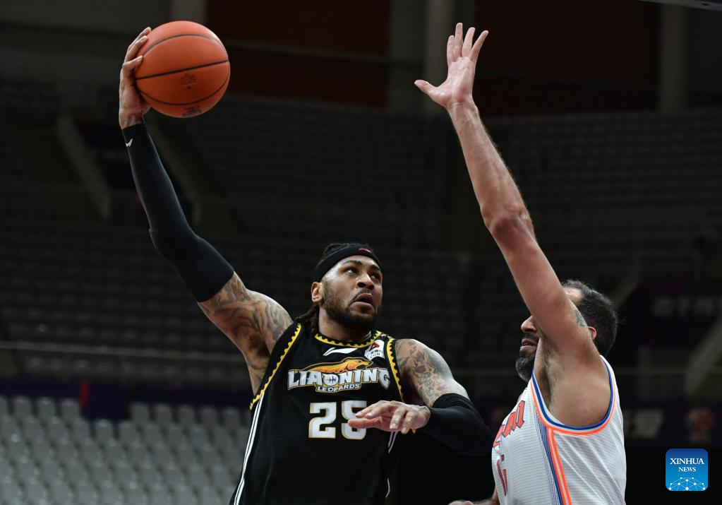 Eric Moreland (L) of Liaoning Flying Leopards competes during the 35th round match between Liaoning Flying Leopards and Sichuan Blue Whales at the 2021-2022 season of the Chinese Basketball Association (CBA) league in Shenyang of northeast China's Liaoning Province, March 15, 2022. (Xinhua/Wang Yijie)