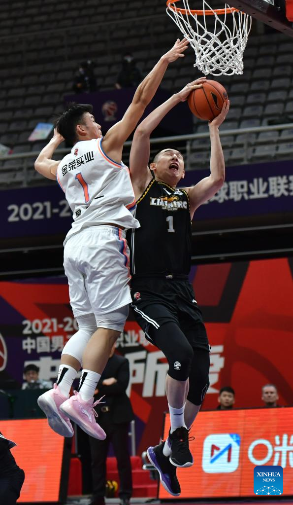Zhao Jiwei (L) of Liaoning Flying Leopards competes during the 35th round match between Liaoning Flying Leopards and Sichuan Blue Whales at the 2021-2022 season of the Chinese Basketball Association (CBA) league in Shenyang of northeast China's Liaoning Province, March 15, 2022. (Xinhua/Wang Yijie)