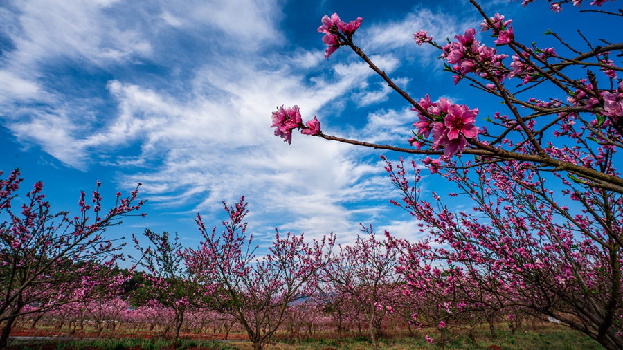 Recently, over 130,000 square meters of peach flowers have blossomed in the city of Yuxi, southwest China's Yunnan Province, forming a sea of vivid pink hues carpeting the entire locality. (Photo/Yang Honglong)