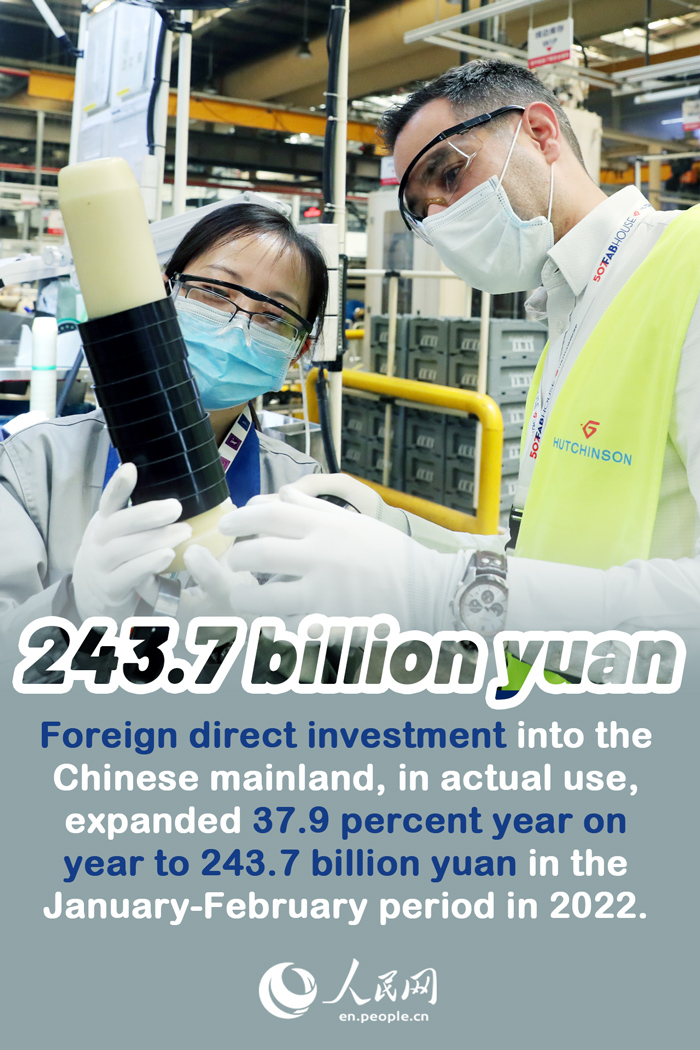 Foreign direct investment into the Chinese mainland, in actual use, expanded 37.9 percent year on year to 243.7 billion yuan in the January-February period, the Ministry of Commerce (MOC) said Monday.