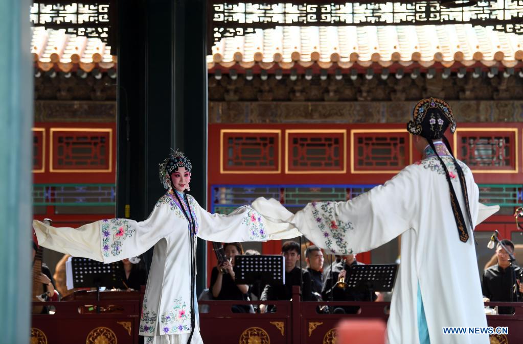 Performers Shao Tianshuai (L) and Wang Chen perform the Kunqu opera masterpiece "The Peony Pavilion" at the Palace Museum in Beijing, capital of China, May 17, 2021. (Xinhua/Jin Liangkuai)