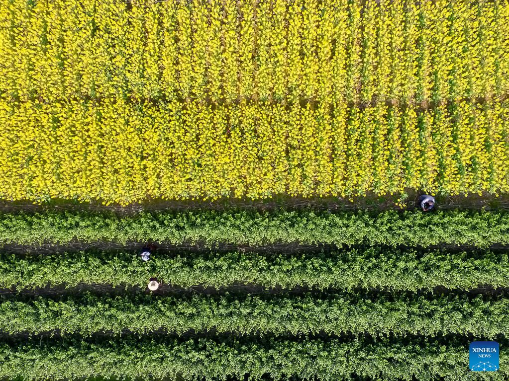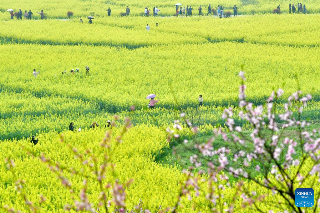 People enjoy the view of cole flowers in Shuangfeng County of Loudi, central China's Hunan Province, March 15, 2022. (Photo by Li Jianxin/Xinhua)