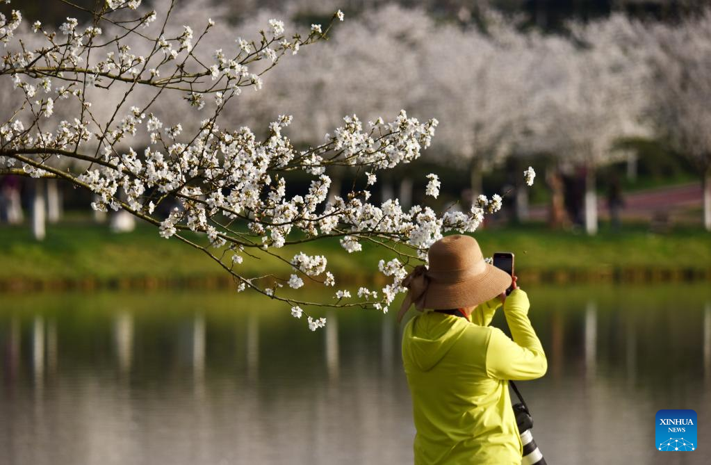 A visitor takes pictures in Wuyi County of Jinhua, east China's Zhejiang Province, March 15, 2022. (Photo by Zhang Jiancheng/Xinhua)