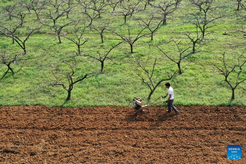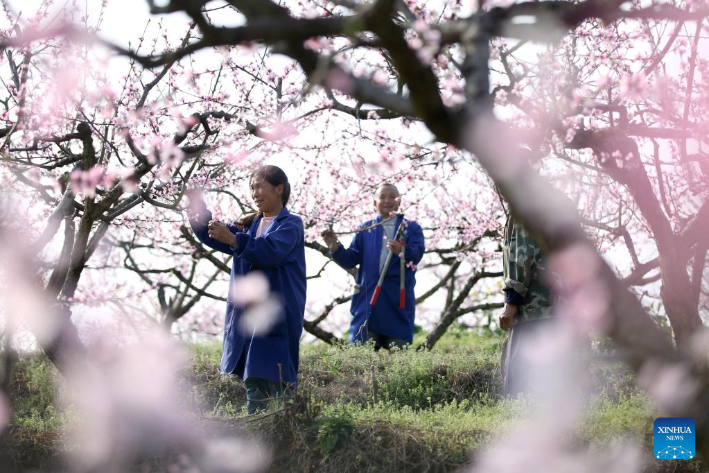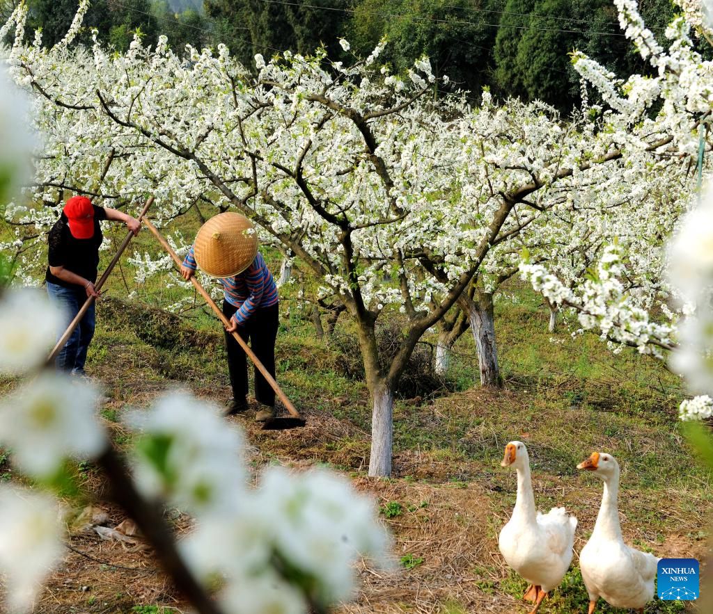 People work in a plum orchard in Liulingou Village of Zhongjiang County, southwest China's Sichuan Province, March 15, 2022. (Photo by Xiao Kaifeng/Xinhua)