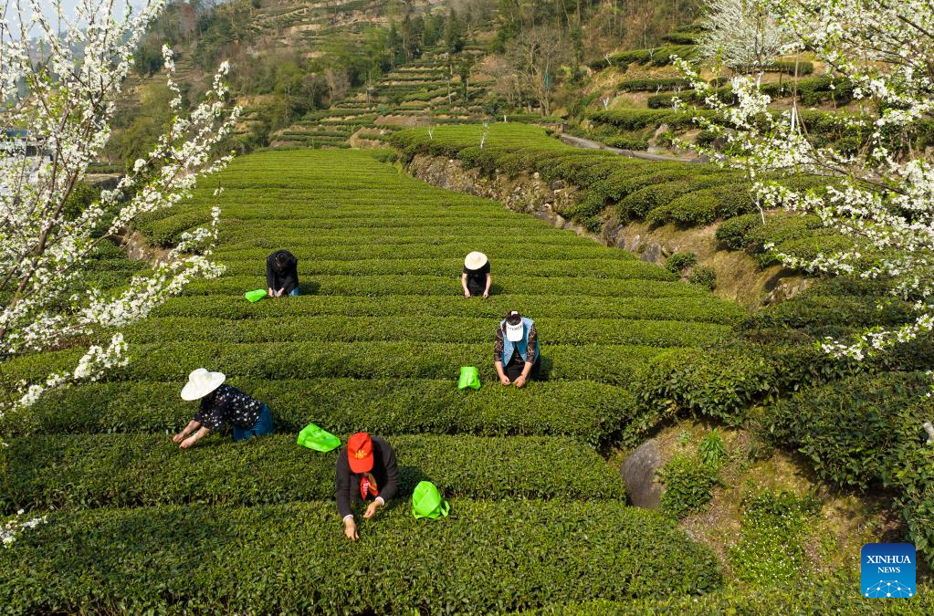 Villagers work in a tea garden in Danzhai County, southwest China's Guizhou Province, March 15, 2022. (Photo by Huang Xiaohai/Xinhua)