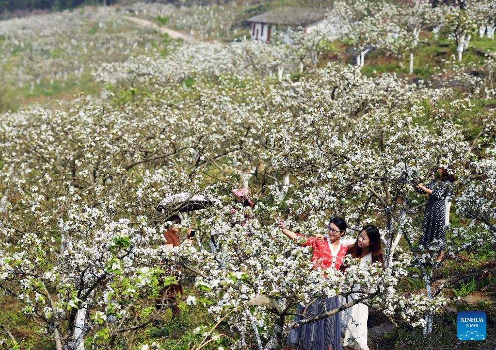 People enjoy themselves in a pear orchard in Peng'an County of Nanchong, southwest China's Sichuan Province, March 15, 2022. (Photo by Liu Yonghong/Xinhua)