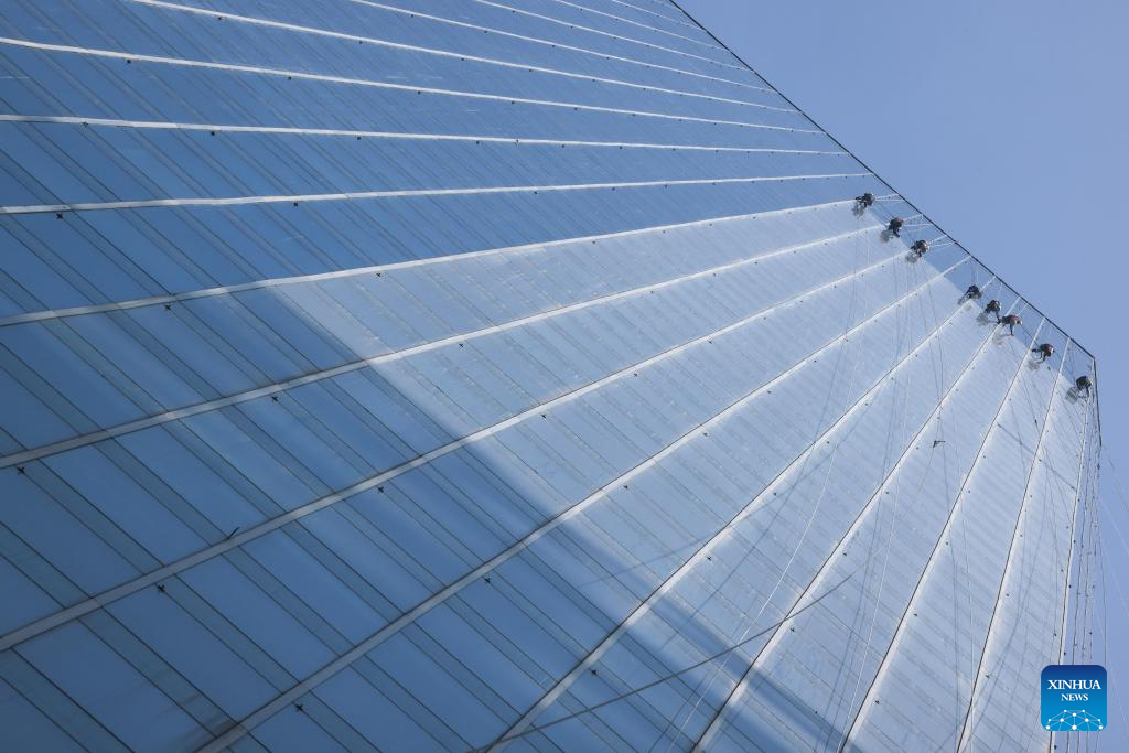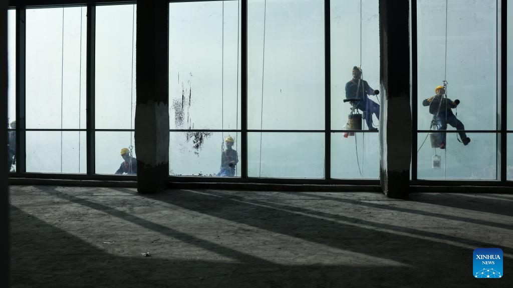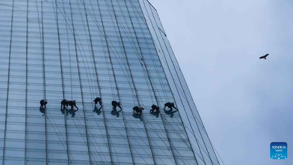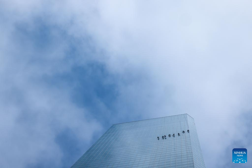 Skyscraper window cleaners prepare to clean the exterior of Guiyang International Trade Center in Guiyang, southwest China's Guizhou Province, March 15, 2022. The 335-meter-high twin skyscrapers of Guiyang International Trade Center recently saw their first exterior wall cleaning this year. The cleaning, carried out by eight workers, is expected to take about 20 days. (Xinhua/Ou Dongqu)