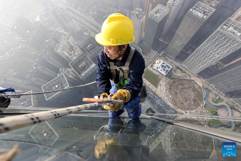 A skyscraper window cleaner fastens his safety harness before cleaning the exterior of Guiyang International Trade Center in Guiyang, southwest China's Guizhou Province, March 15, 2022. The 335-meter-high twin skyscrapers of Guiyang International Trade Center recently saw their first exterior wall cleaning this year. The cleaning, carried out by eight workers, is expected to take about 20 days. (Xinhua/Ou Dongqu)