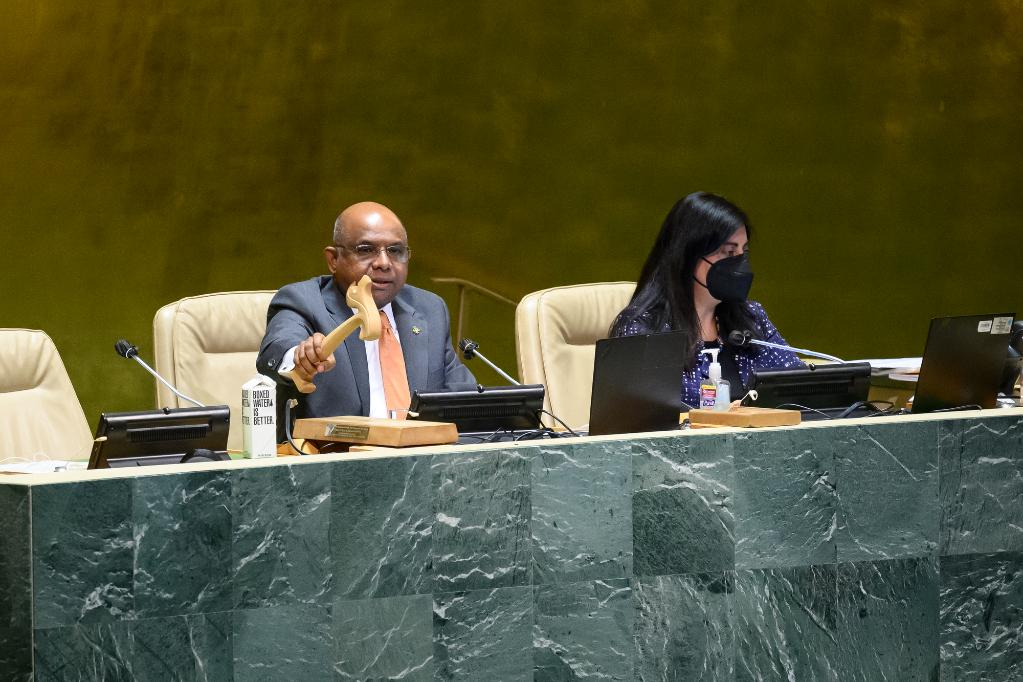 UN General Assembly President Abdulla Shahid (L) chairs a General Assembly meeting at the UN headquarters in New York, on March 15, 2022. The General Assembly on Tuesday adopted a resolution to designate March 15 as the International Day to Combat Islamophobia. (Loey Felipe/UN Photo/Handout via Xinhua)