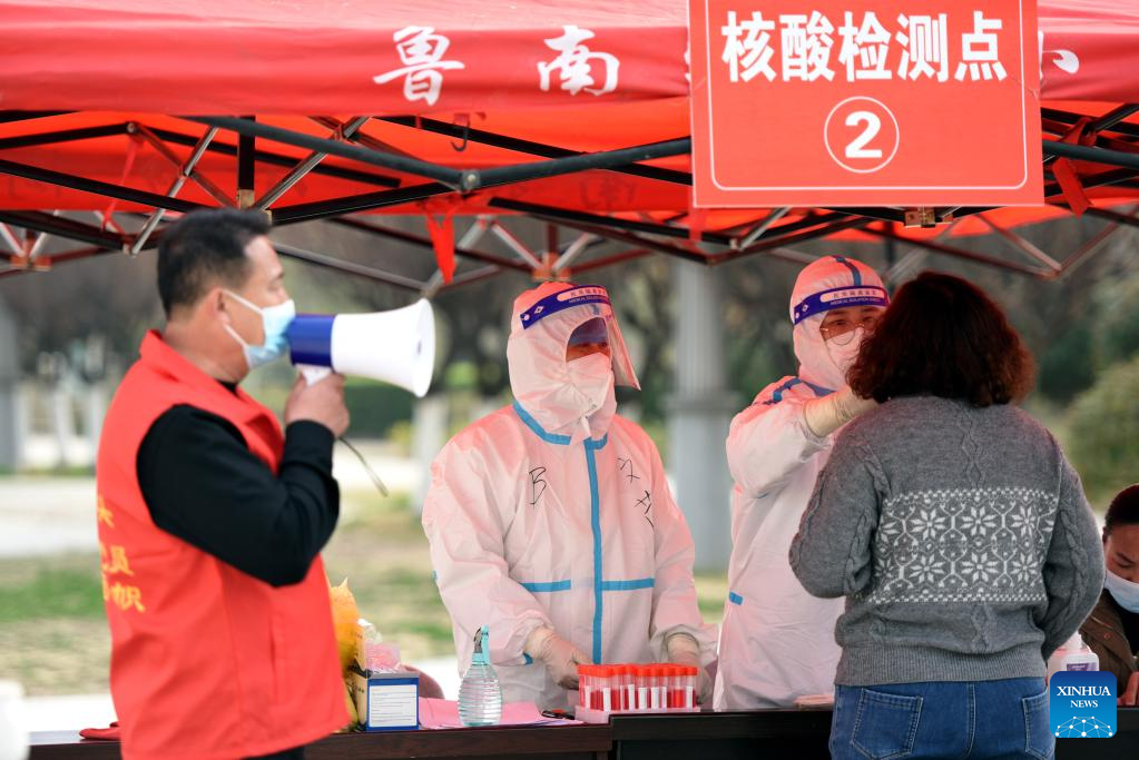 A medical worker takes a swab sample from a resident for nucleic acid testing in Xigang Township of Tengzhou City, east China's Shandong Province, March 15, 2022. (Photo by Li Zhijun/Xinhua)
