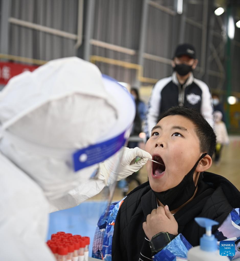 A medical worker takes a swab sample from a child for nucleic acid testing in Qingdao, east China's Shandong Province, March 14, 2022. (Photo by Liu Qiang/Xinhua)