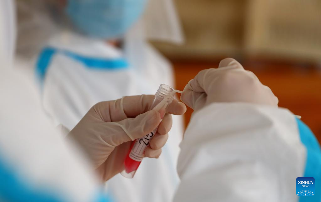 A medical worker deals with a swab sample for nucleic acid testing in Xigang Township of Tengzhou City, east China's Shandong Province, March 15, 2022. (Photo by Li Zhijun/Xinhua)