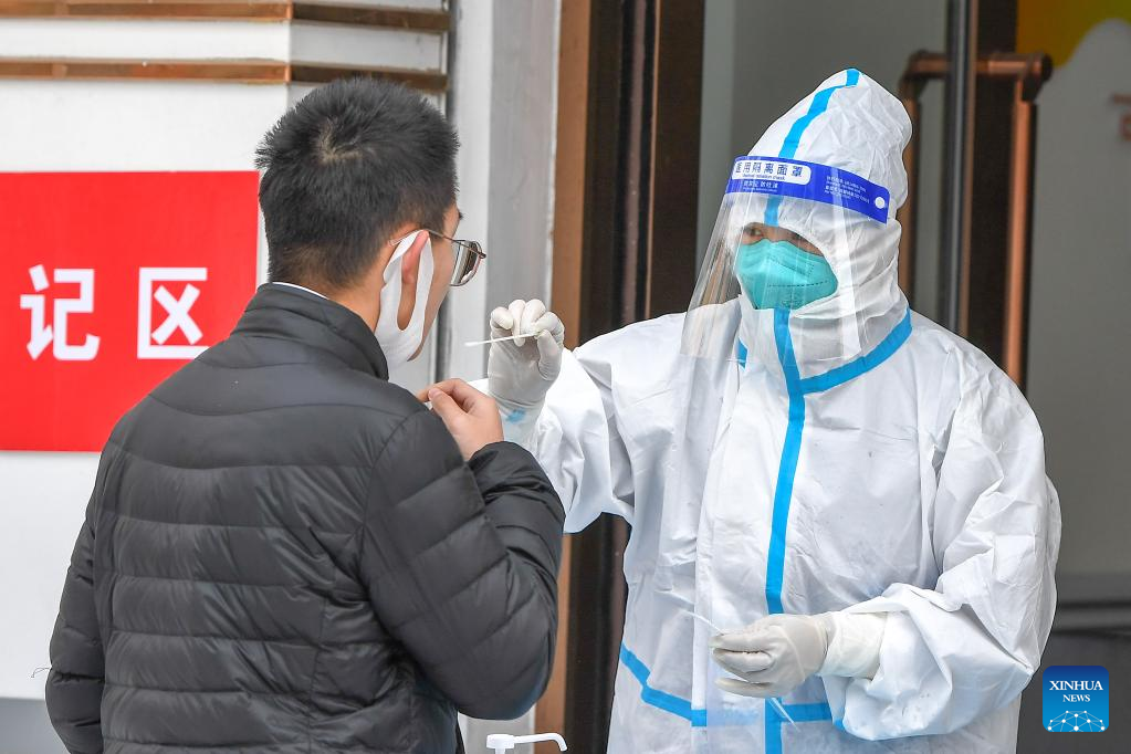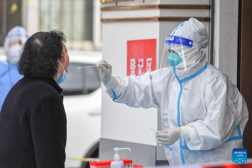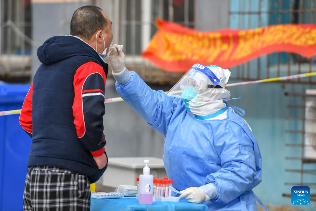 Cellphone photo taken on March 15, 2022 shows a medical worker taking a swab sample from a resident for nucleic acid test in Changchun, northeast China's Jilin Province, March 15, 2022. Jilin Province reported 3,076 new locally transmitted COVID-19 cases on Monday. (Xinhua/Zhao Dandan)