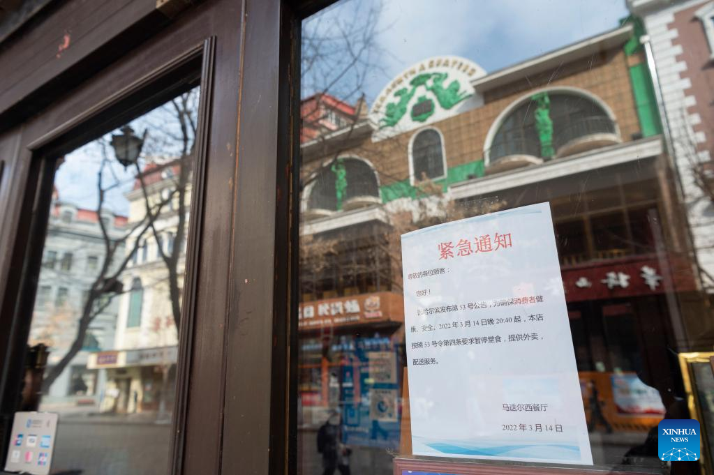 A notice saying that the restaurant suspends eat-in service is seen on the Central Street in Harbin, northeast China's Heilongjiang Province, March 15, 2022. Harbin announced on Monday that enclosed public spaces should be temporarily closed. Anti-epidemic measures also include suspending cultural activities, night market, exhibitions and mass gatherings. (Xinhua/Xie Jianfei)