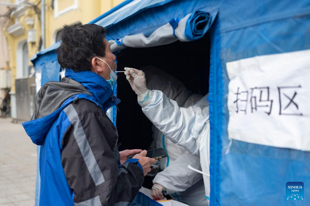 A medical staff conducts a nucleic acid test on a man at a COVID-19 testing site in Harbin, northeast China's Heilongjiang Province, March 15, 2022. Harbin announced on Monday that enclosed public spaces should be temporarily closed. Anti-epidemic measures also include suspending cultural activities, night market, exhibitions and mass gatherings. (Xinhua/Xie Jianfei)