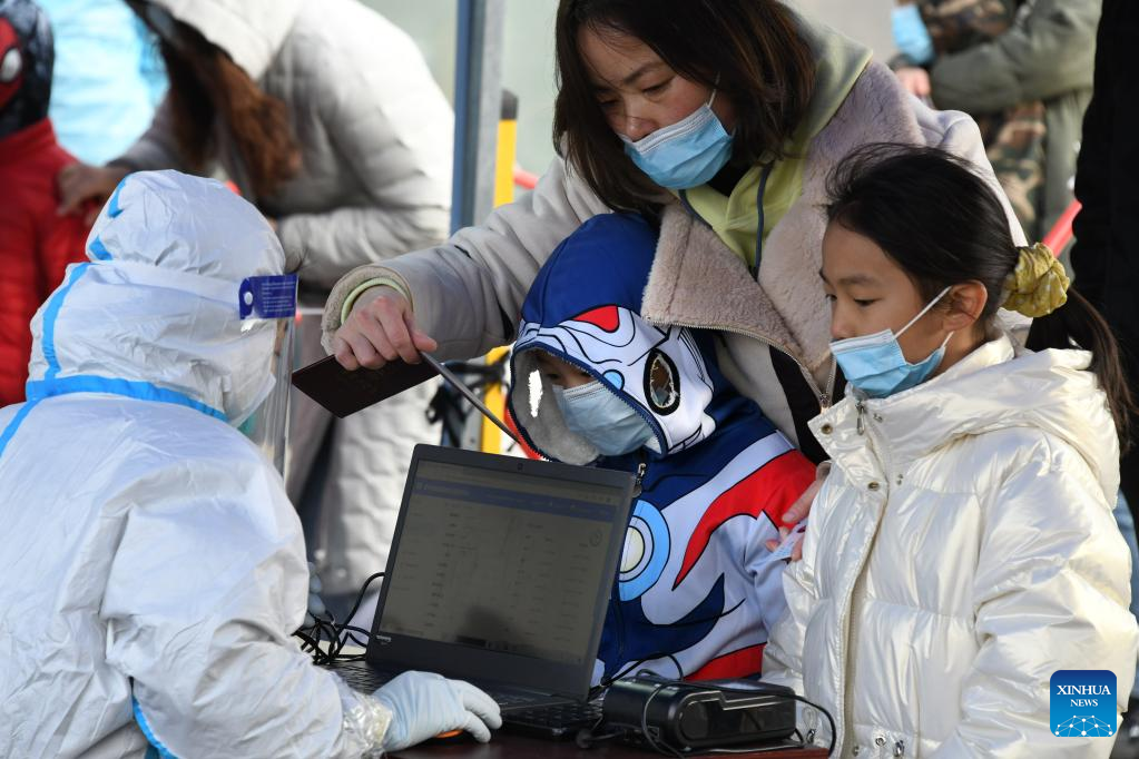 Medical workers take swab samples from people for nucleic acid test at Shibei District, Qingdao City, east China's Shandong Province, March 15, 2022. Qingdao has strengthened its epidemic prevention and control measures in response to the resurgence of domestically transmitted COVID-19 cases. (Xinhua/Li Ziheng)