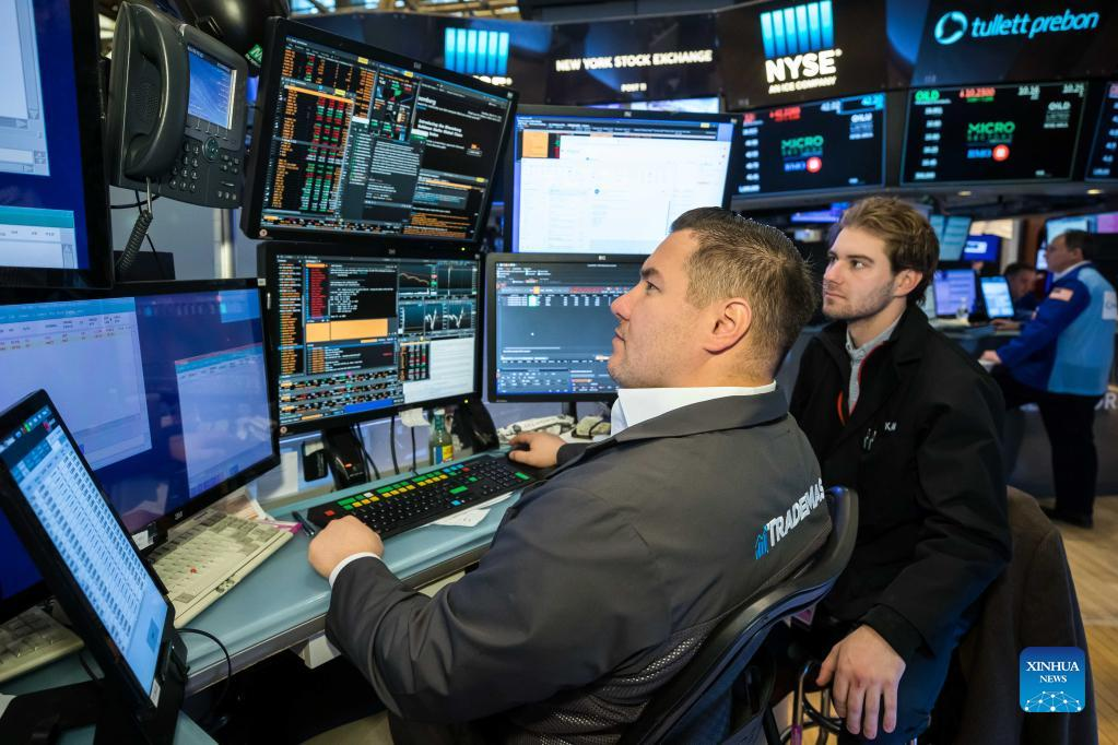 Traders work at the New York Stock Exchange in New York, the United States, March 15, 2022. U.S. stocks rose noticeably on Tuesday, buoyed by a comeback in tech names. The Dow Jones Industrial Average jumped 599.10 points, or 1.82 percent, to 33,544.34. The S&P 500 was up 89.34 points, or 2.14 percent, to 4,262.45. The Nasdaq Composite Index increased 367.40 points, or 2.92 percent, to 12,948.62. (Courtney Crow/NYSE/handout via Xinhua)