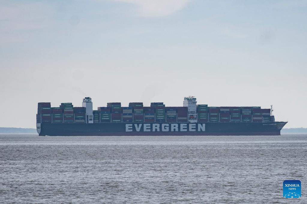 Photo taken on March 15, 2022 shows the container vessel Ever Forward in the Maryland portion of the Chesapeake Bay, the United States. The giant container vessel has been stuck in the Chesapeake Bay, the largest inlet in the Atlantic Coastal Plain of the eastern United States. Ever Forward remains "aground" in the Maryland portion of the Chesapeake Bay as of Tuesday afternoon, according to VesselFinder, a vessel tracking website. (Xinhua/Liu Jie)
