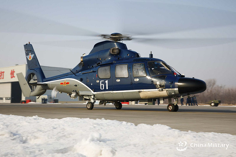 A helicopter attached to a regiment of the PLA Naval Aviation University gets ready to lift off during a fight training course on February 11, 2022. (eng.chinamil.com.cn/Photo by Liu Zhaoyuan)