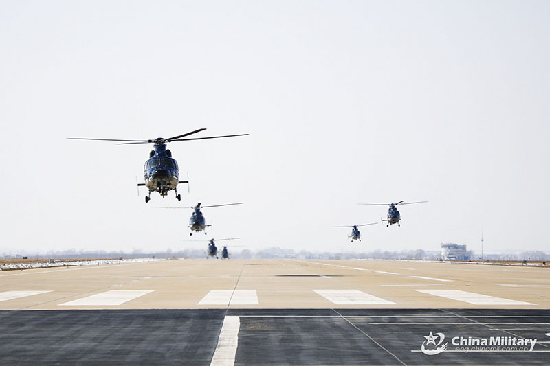 Helicopters attached to a regiment of the PLA Naval Aviation University conduct hover checks before a fight training course on February 11, 2022. (eng.chinamil.com.cn/Photo by Liu Zhaoyuan)