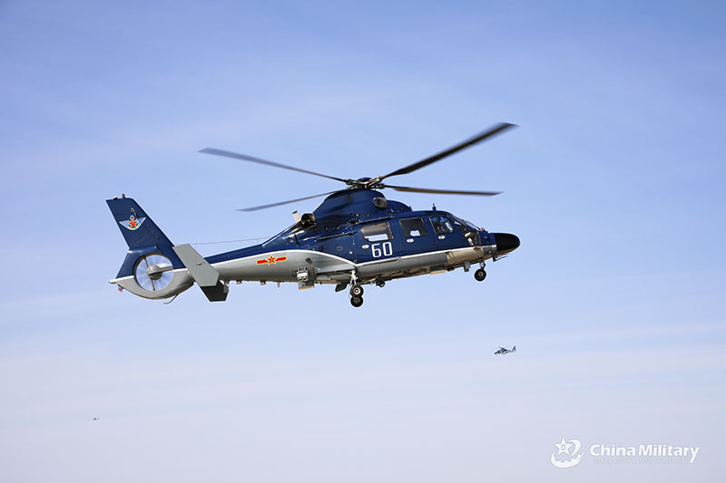 A helicopter attached to a regiment of the PLA Naval Aviation University flies in the sky during a fight training course on February 11, 2022. (eng.chinamil.com.cn/Photo by Liu Zhaoyuan)