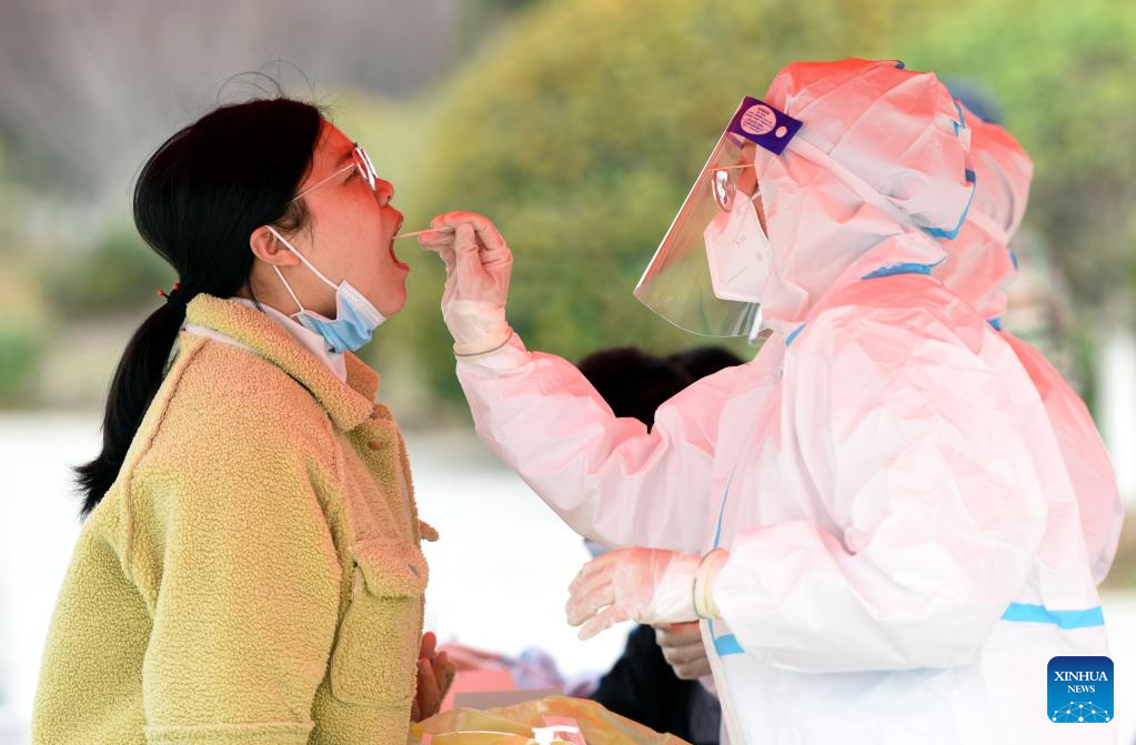 A medical worker takes a swab sample from a resident for nucleic acid testing in Tancheng county of Linyi city, East China's Shandong province, March 15, 2022. [Photo/Xinhua]