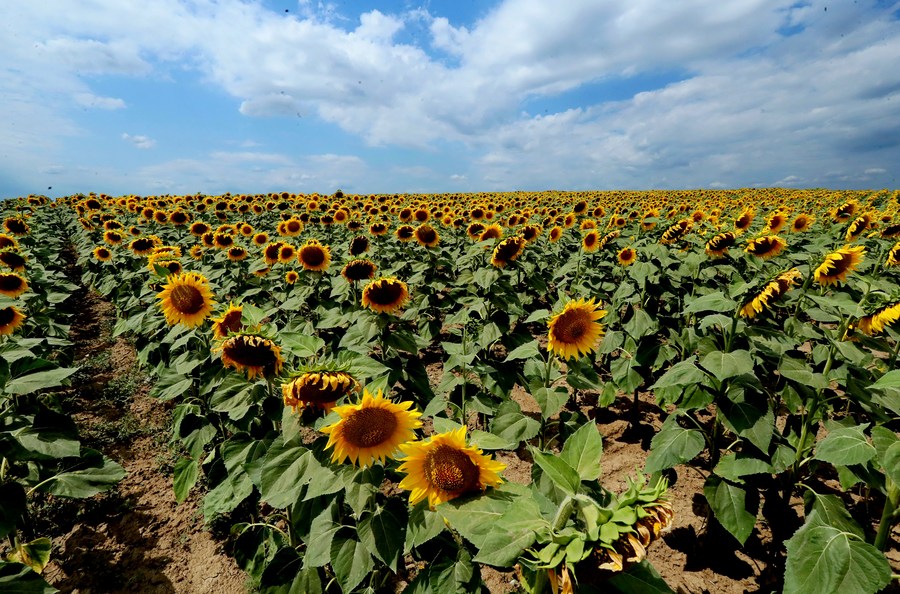 Photo taken on July 9, 2019 shows sunflower fields in Odessa, Ukraine. (Xinhua/Chen Junfeng)